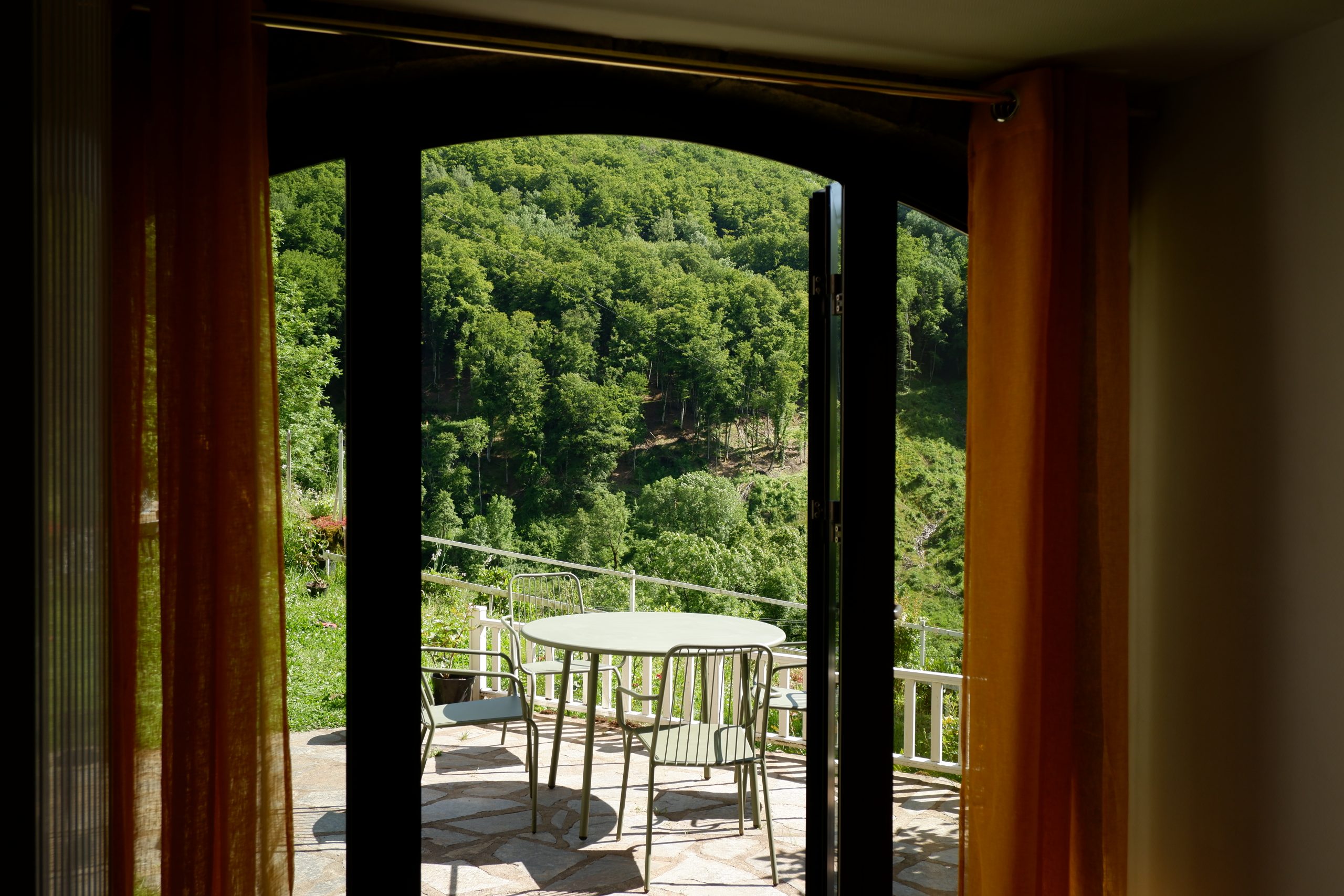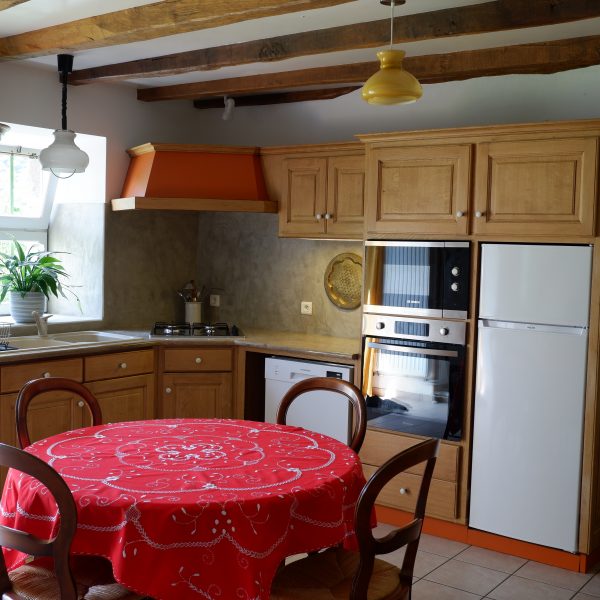 La cuisine donne sur une terrasse avec une table et 4 chaises permettant de manger dehors, face à la nature, un plaisir simple et inoubliable .