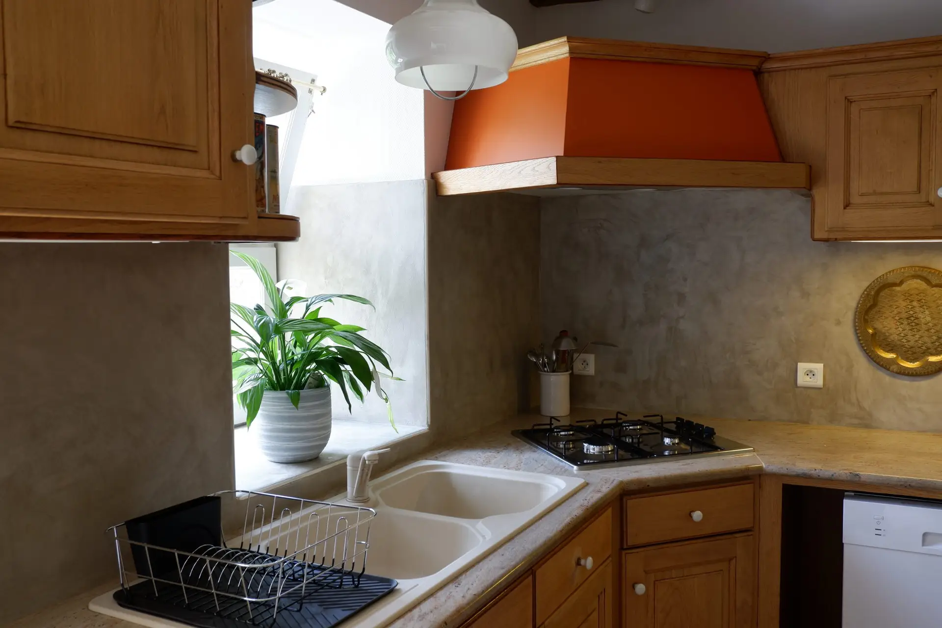 L'arrière cuisine cache le chauffe-eau et des rangements très pratiques.